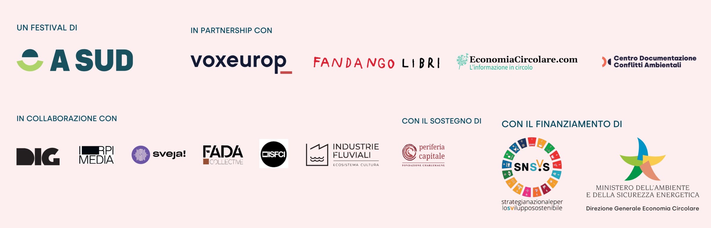 Il festival è realizzato nell’ambito dell’Avviso pubblico per proposte di iniziative a supporto dell’attuazione della Strategia Nazionale per lo Sviluppo Sostenibile – Vettore “Cultura della sostenibilità” (SNSVS3)”. Ministero dell’Ambiente e della Sicurezza Energetica – Strumenti e tecnologie per lo sviluppo sostenibile. Direzione Generale Economia Circolare.