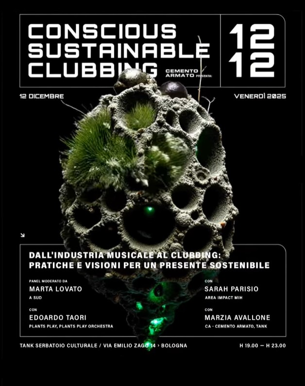 Venerdì 12 dicembre 2025, al TANK serbatoio culturale, si apre uno spazio di confronto che va oltre la retorica della “sostenibilità culturale”. Insieme a Music Innovation Hub, A Sud, Plants Play e Cemento Armato esploreremo come la musica è uno strumento reale di sostenibilità: dalle politiche culturali alla giustizia climatica, dall’arte bio-sonora alla club culture come spazio di trasformazione.