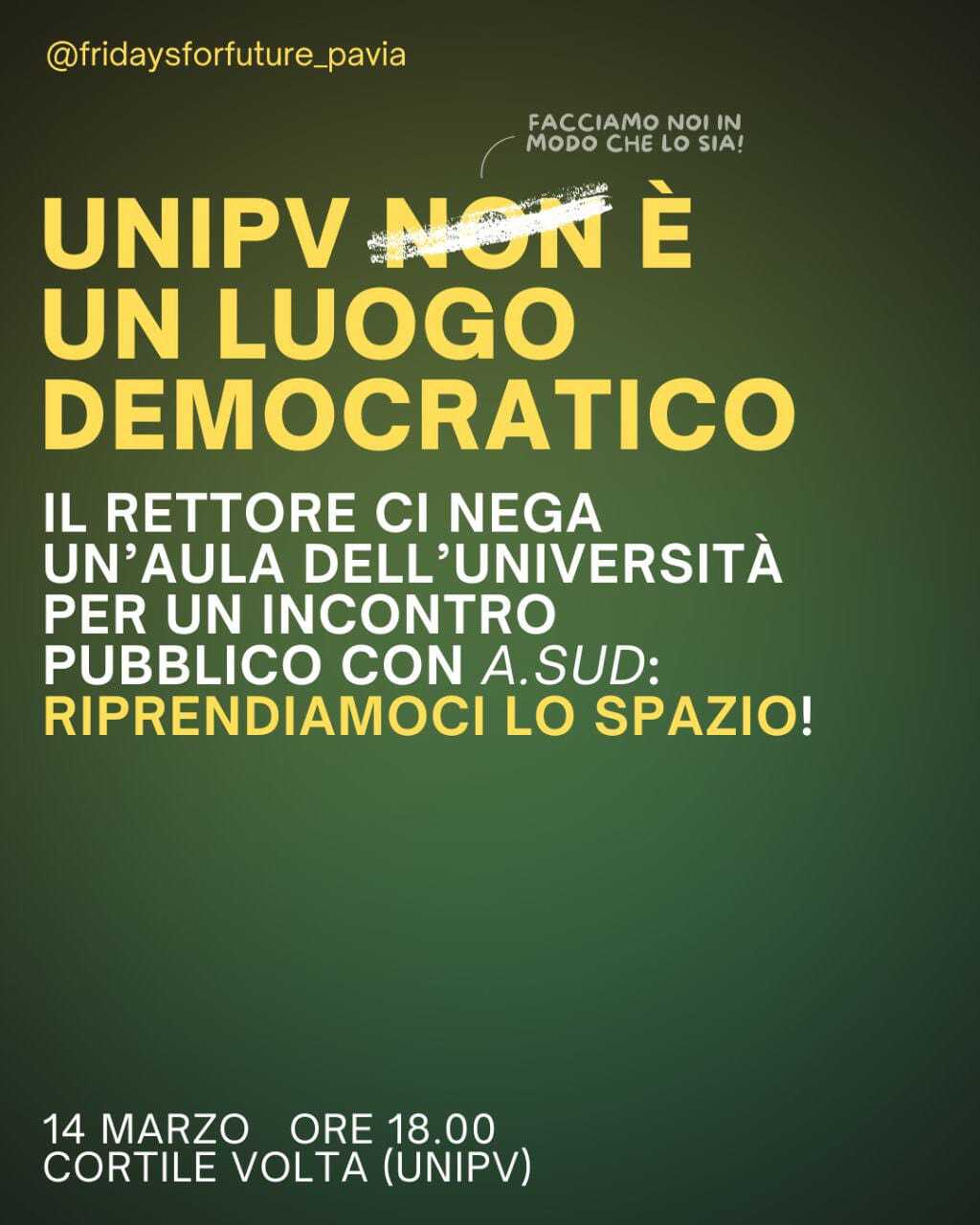 L’incontro era inizialmente previsto nell’Aula Grande dell’Università di Pavia, ma l’università ha provato a censurare l’evento negando lo spazio alle realtà studentesche.