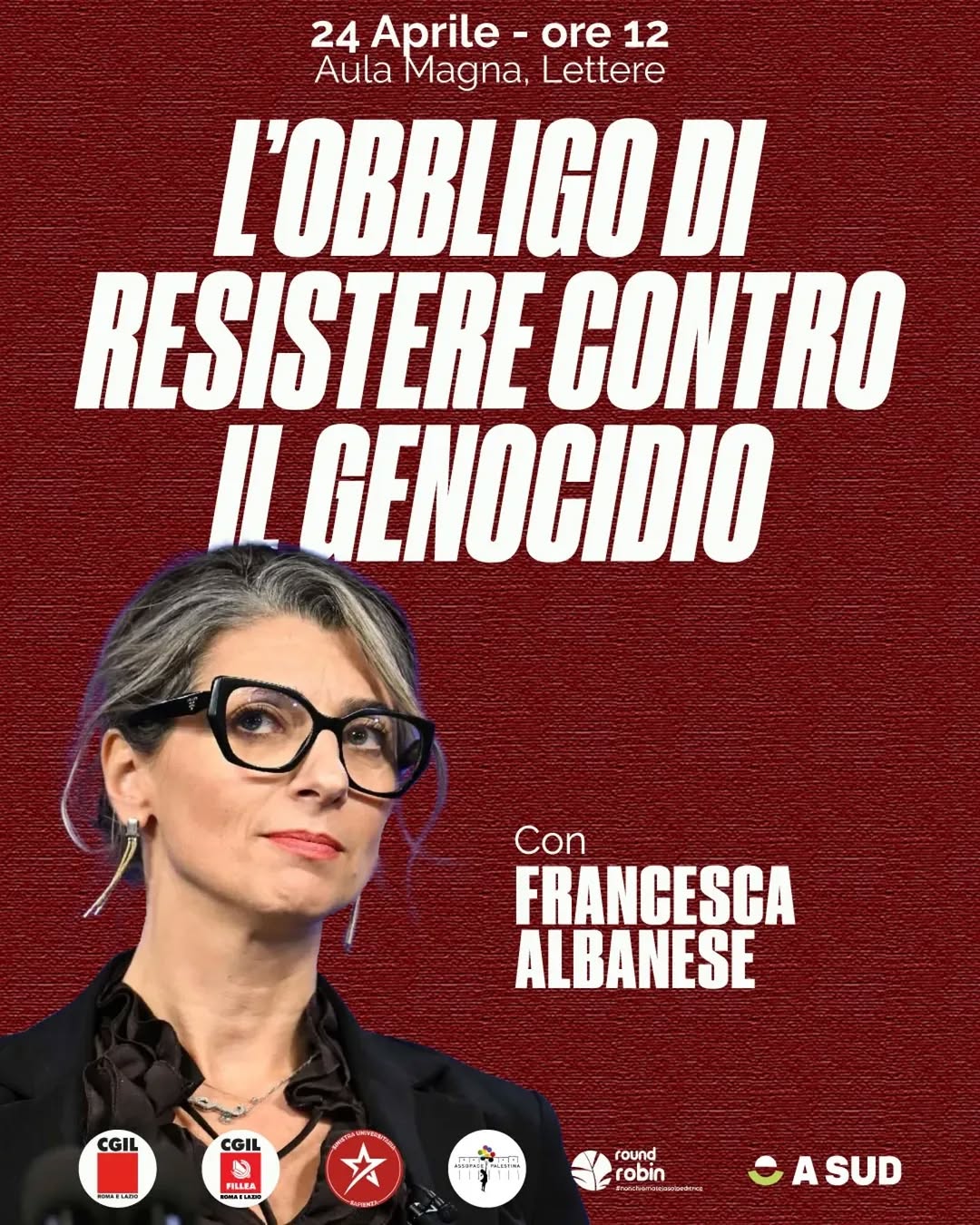 La cittadinanza, la comunità accademica, le realtà solidali e gli organi di informazione sono caldamente invitati a partecipare il 24 aprile, per una presa di parola collettiva contro il genocidio e per la libertà del popolo palestinese.