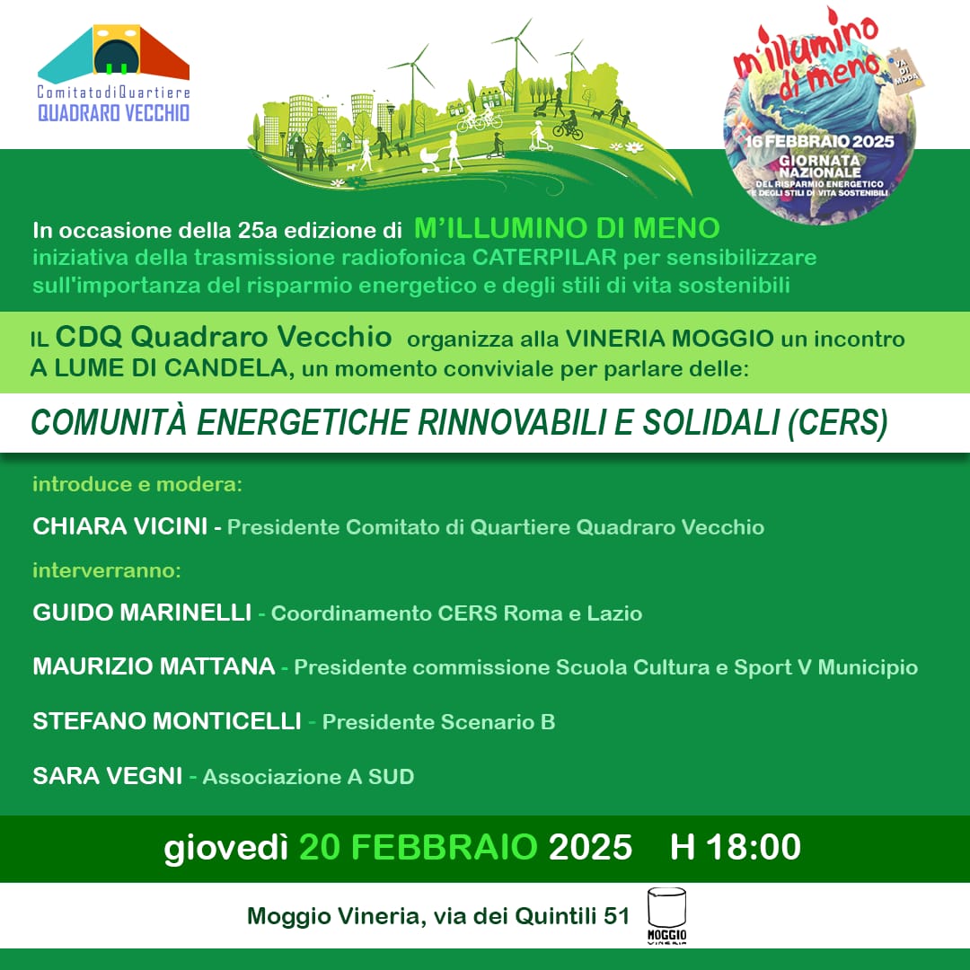 In occasione della 25° edizione di M’Illumino di Meno, il Comitato di Quartiere del Quadraro organizza un incontro a lume di candela: un momento conviviale per parlare insieme di Comunità Energetiche Rinnovabili e Solidali (CERS).