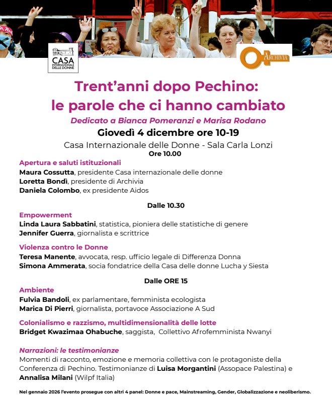 Giovedì 4 dicembre, alla Casa Internazionale delle Donne nella Sala Carla Lonzi, si terrà una giornata interamente dedicata ai trent’anni dalla Conferenza di Pechino. Un appuntamento pensato per ricordare un passaggio fondamentale nella storia dei diritti e per riflettere sul suo significato oggi, attraverso voci provenienti da ambiti differenti.