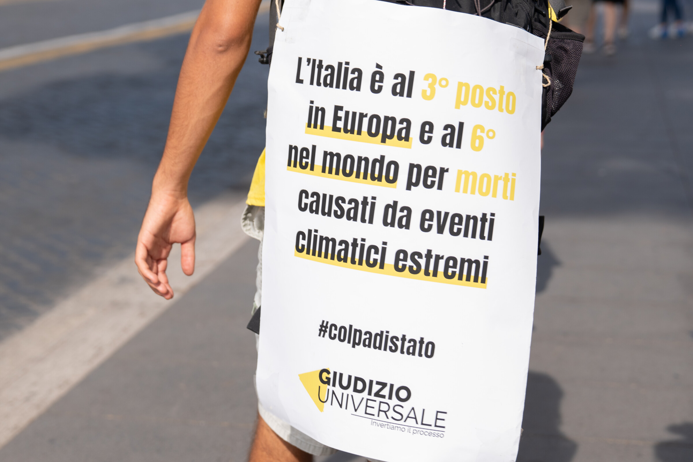 “Abbiamo vissuto un’estate di siccità e di incendi, di alluvioni ed eventi estremi. L’Italia divisa in due tra nubifragi e fiamme continua a mostrarci gli impatti della crisi climatica: produzioni agricole a rischio, territori alluvionati, persone sfollate; ci sono geografie e comunità che subiscono gli effetti del dissesto idrogeologico e del cambiamento climatico in maniera violenta, rapida, ingiusta”. Dichiara Lucie Greyl, portavoce della campagna Giudizio Universale e attivista di A Sud. “L’Italia è un hot spot climatico, un punto caldo che si sta riscaldando più velocemente di altri paesi. E lo Stato ha le sue responsabilità: non ha considerato le evidenze scientifiche, non sta rispettando gli accordi internazionali sul clima e continua a intrecciare rapporti con l’industria del fossile. È evidente ormai che le politiche nazionali non sono in grado di affrontare le sfide poste dal cambiamento climatico. Anche le misure programmate dall’Italia nel Piano Nazionale Integrato per l’Energia e il Clima (PNIEC) aggiornato a fine luglio – ammesso che saranno effettivamente realizzate – mirano a conseguire l’obiettivo di una riduzione delle emissioni nel 2030 di appena il 36% rispetto ai livelli del 1990. Mentre le analisi scientifiche che abbiamo usato nell’impianto accusatorio della causa, ci dicono che lo Stato italiano dovrebbe tagliare entro il 2030 i propri livelli emissivi del 92% rispetto ai valori del 1990 per contribuire in modo equo al raggiungimento dell’obiettivo di riscaldamento globale entro 1,5°”.