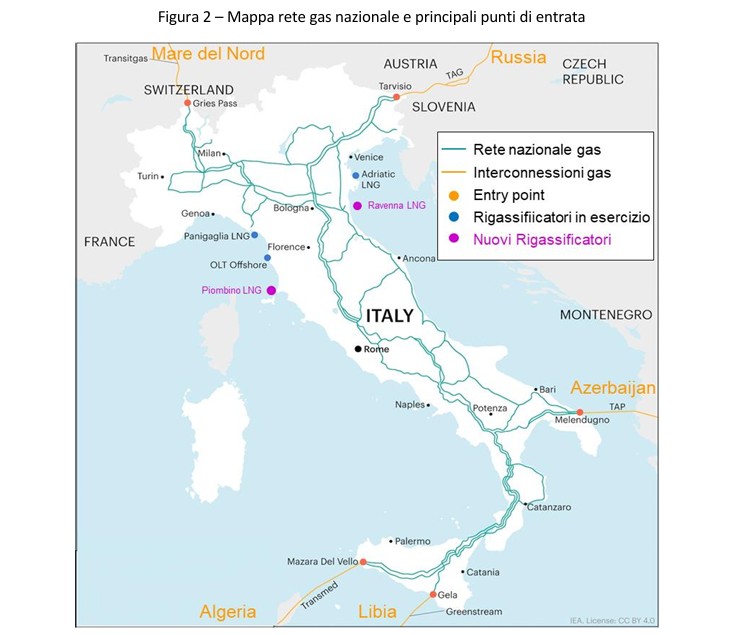 L’attuale ricerca di diversificazione delle fonti di approvvigionamento del gas può portare l’Italia a porsi come un hub nel Mediterraneo, divenendo un punto di immissione di gas e di suo convogliamento verso gli altri paesi europei (Malta, Slovenia, Slovacchia al momento), anche attraverso il rafforzamento di alcune infrastrutture (verso Austria) transfrontaliere e interne (Linea Adriatica).