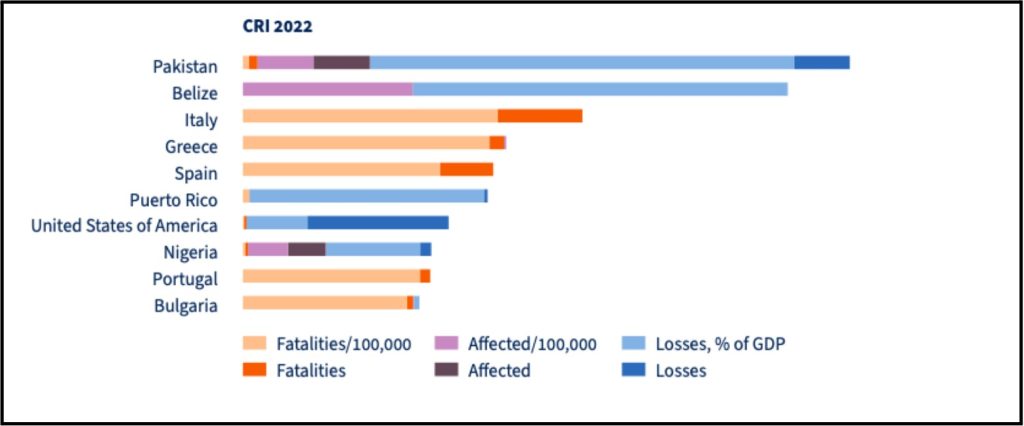 L’Italia ha contato oltre 38.000 morti e danni economici stimati in 60 miliardi di dollari a causa di ondate di calore, siccità e inondazioni (soprattutto tra il 2003-2022). Nel 2022 si è classificata terza a livello mondiale e prima in Europa, soprattutto per il numero di vittime.